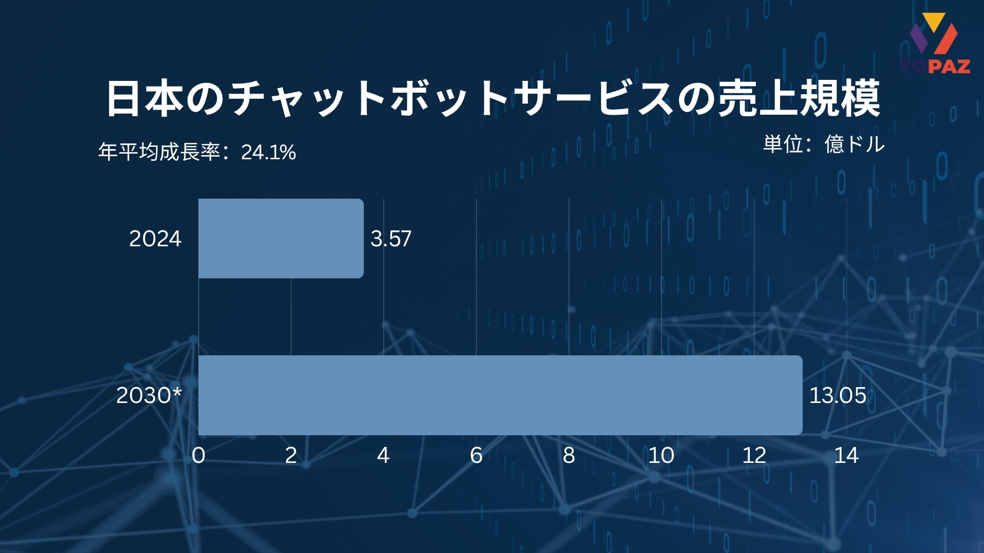 さらに、同じくGrand View Researchによると、2024年時点で日本のAIチャットボット関連サービスの業界売上高は約3.57億ドルとされ、2030年には13.05億ドルに達すると予測されています(年平均成長率は24.1%)。